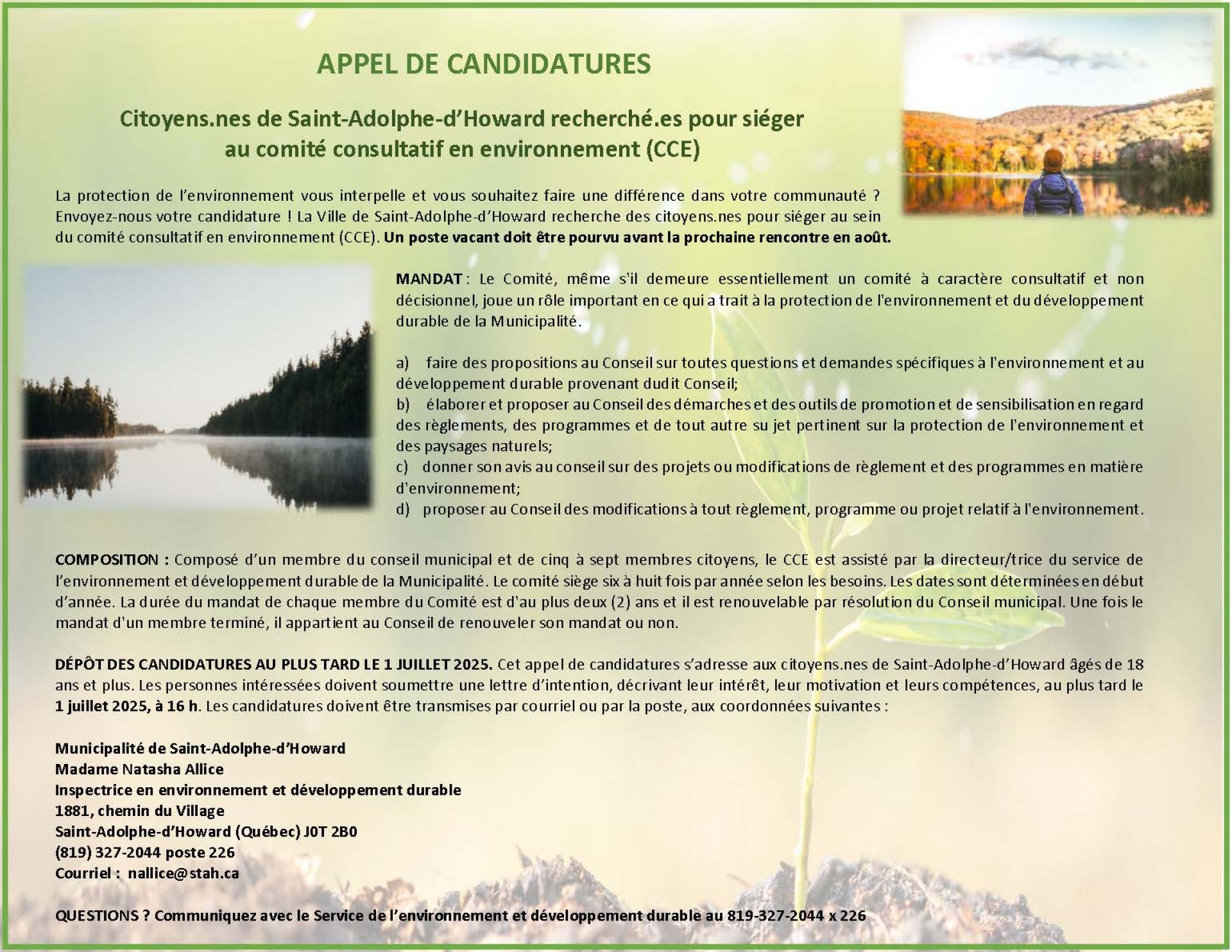 APPEL DE CANDIDATURES Citoyens.nes de Saint-Adolphe-d’Howard recherché.es pour siéger au comité consultatif en environnement (CCE)